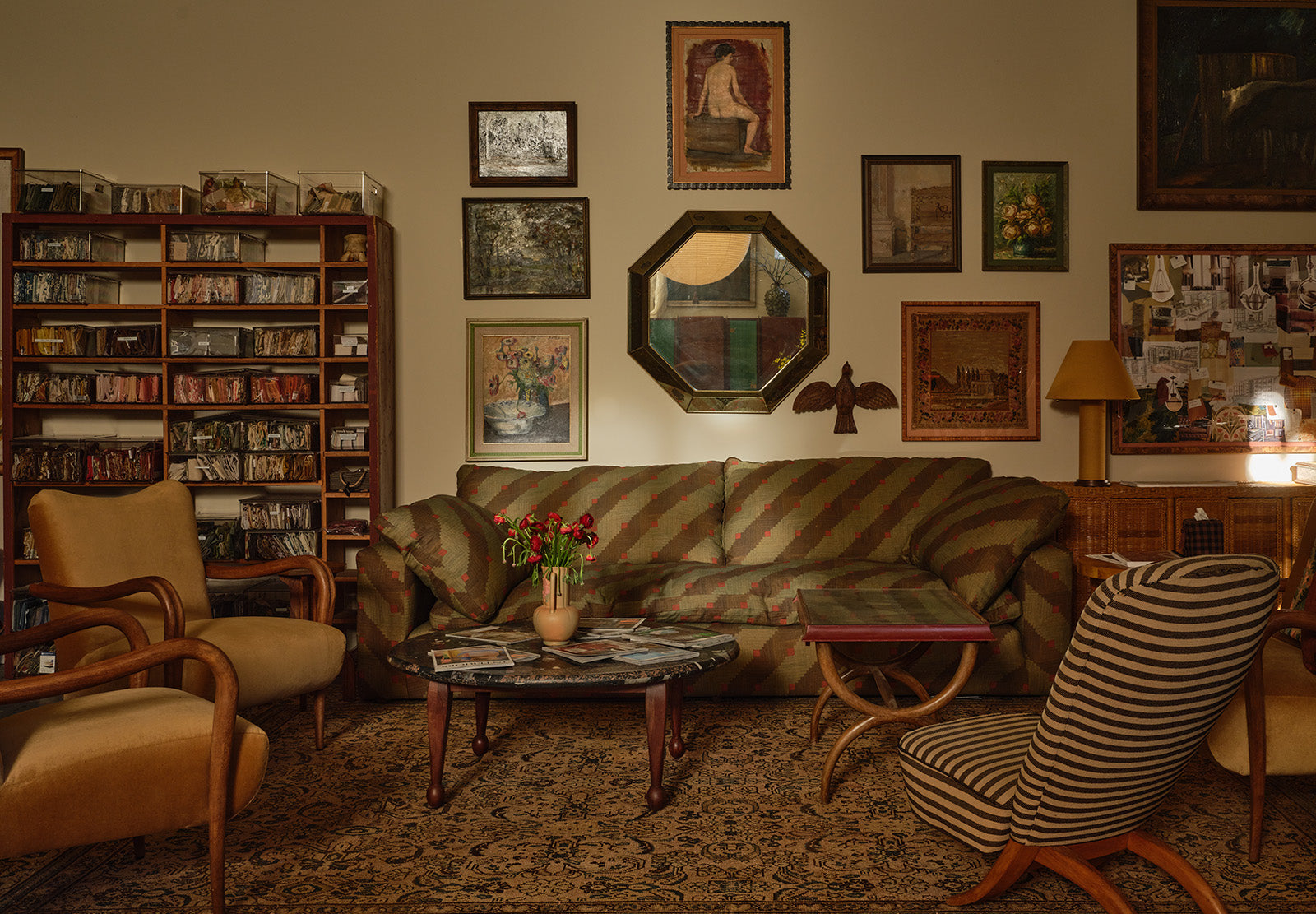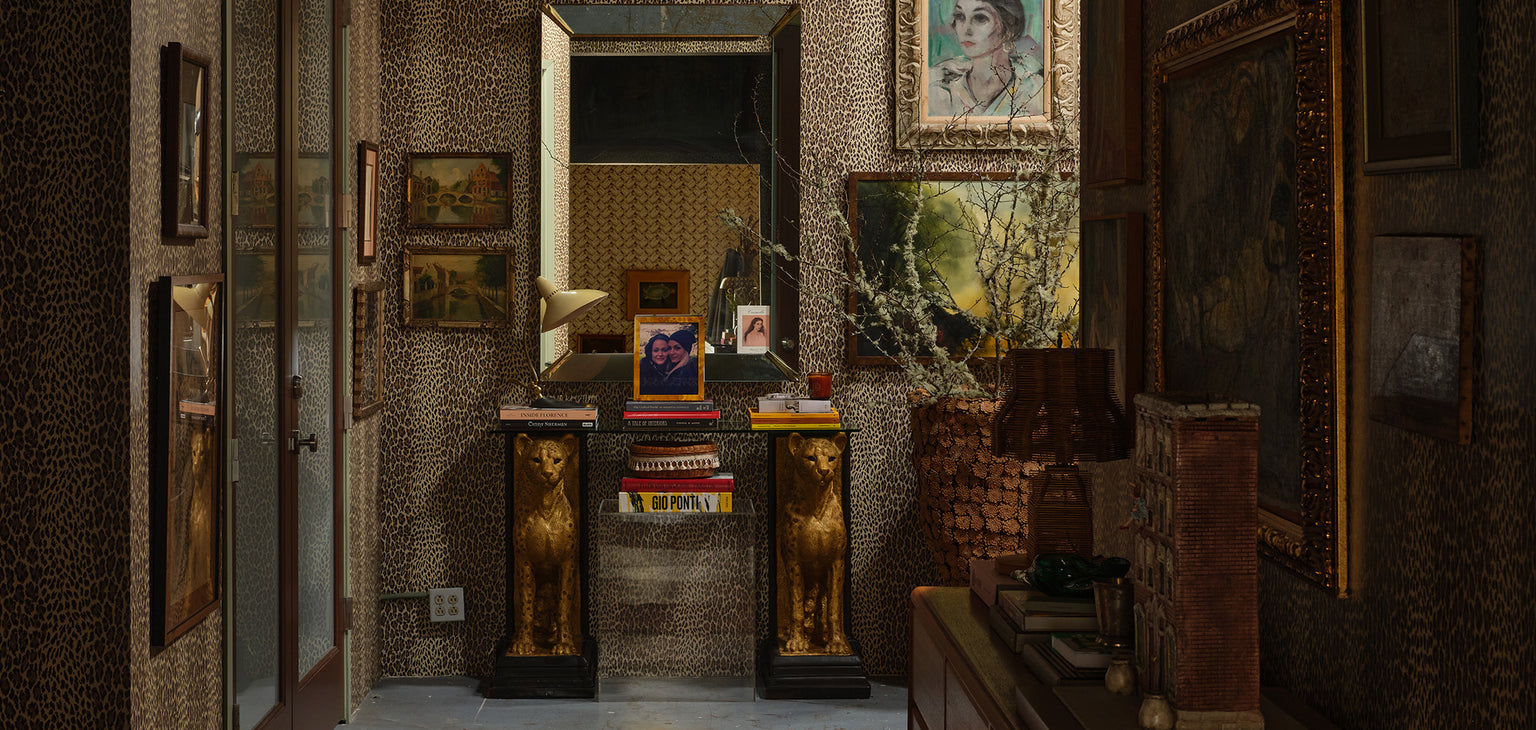 At the entrance of the studio, two cheetahs stand sentry, guarding an antique console and book-laden acrylic table, against a backdrop of muted leopard spots. This initial vignette sums up the whole space; storied, effortless and perfectly Pierce & Ward.