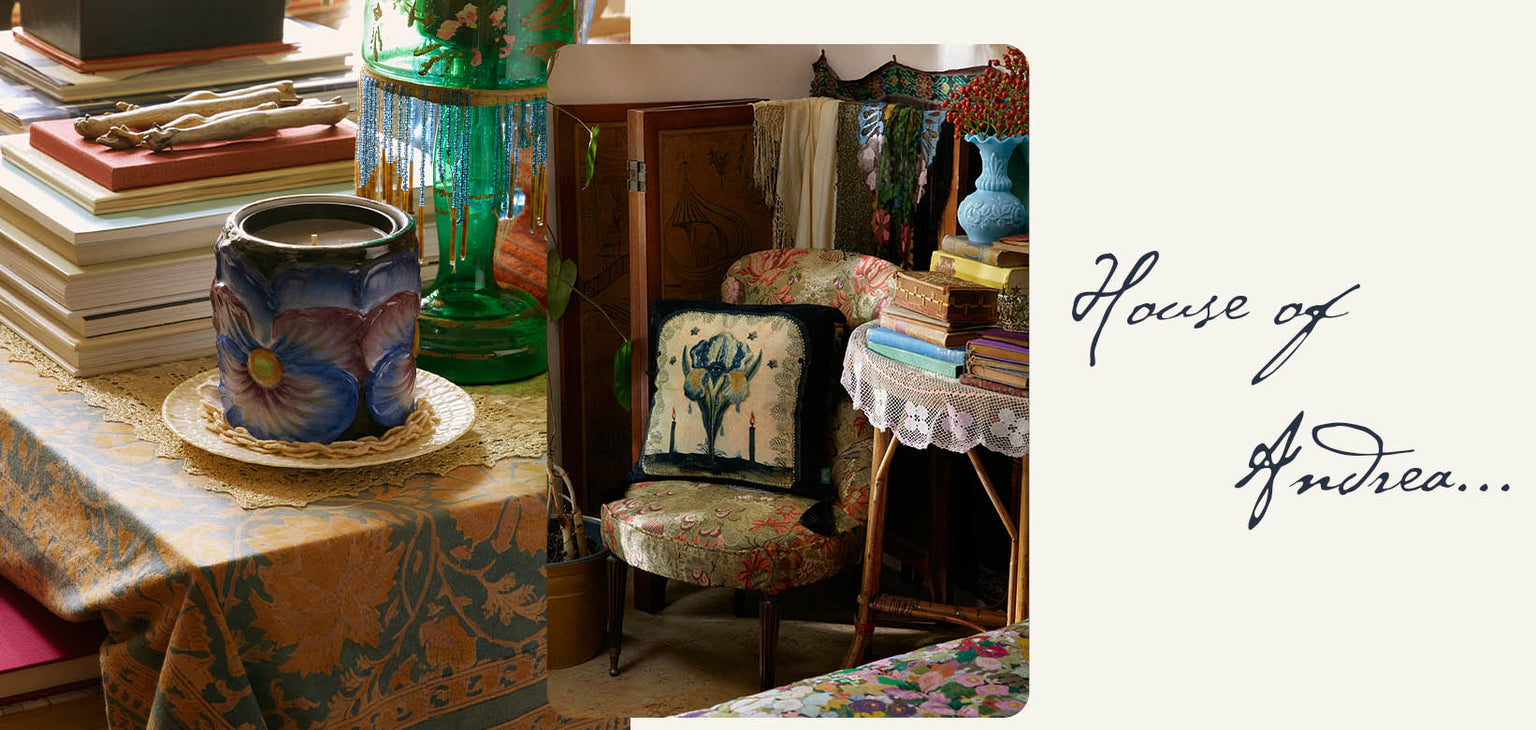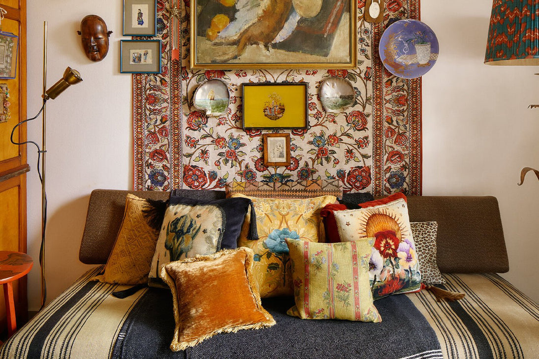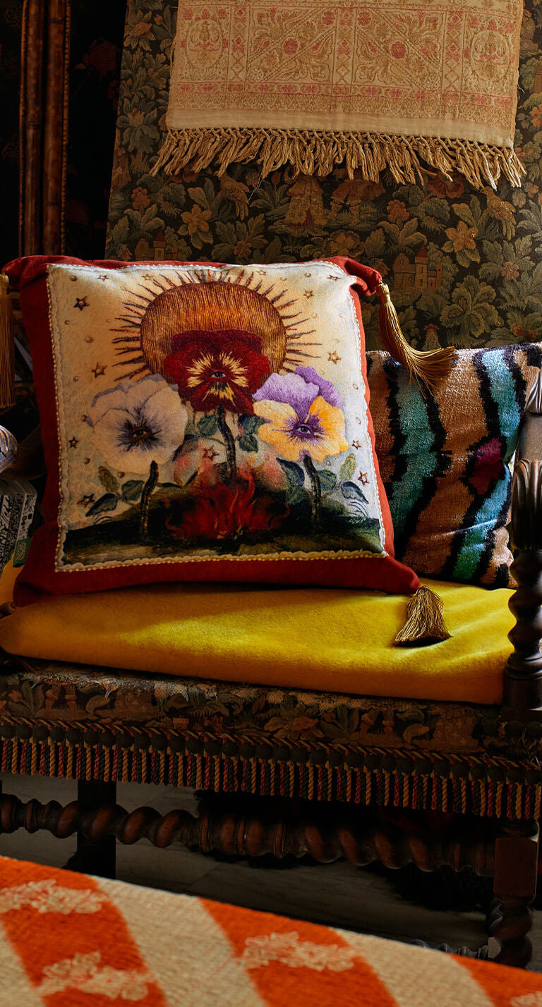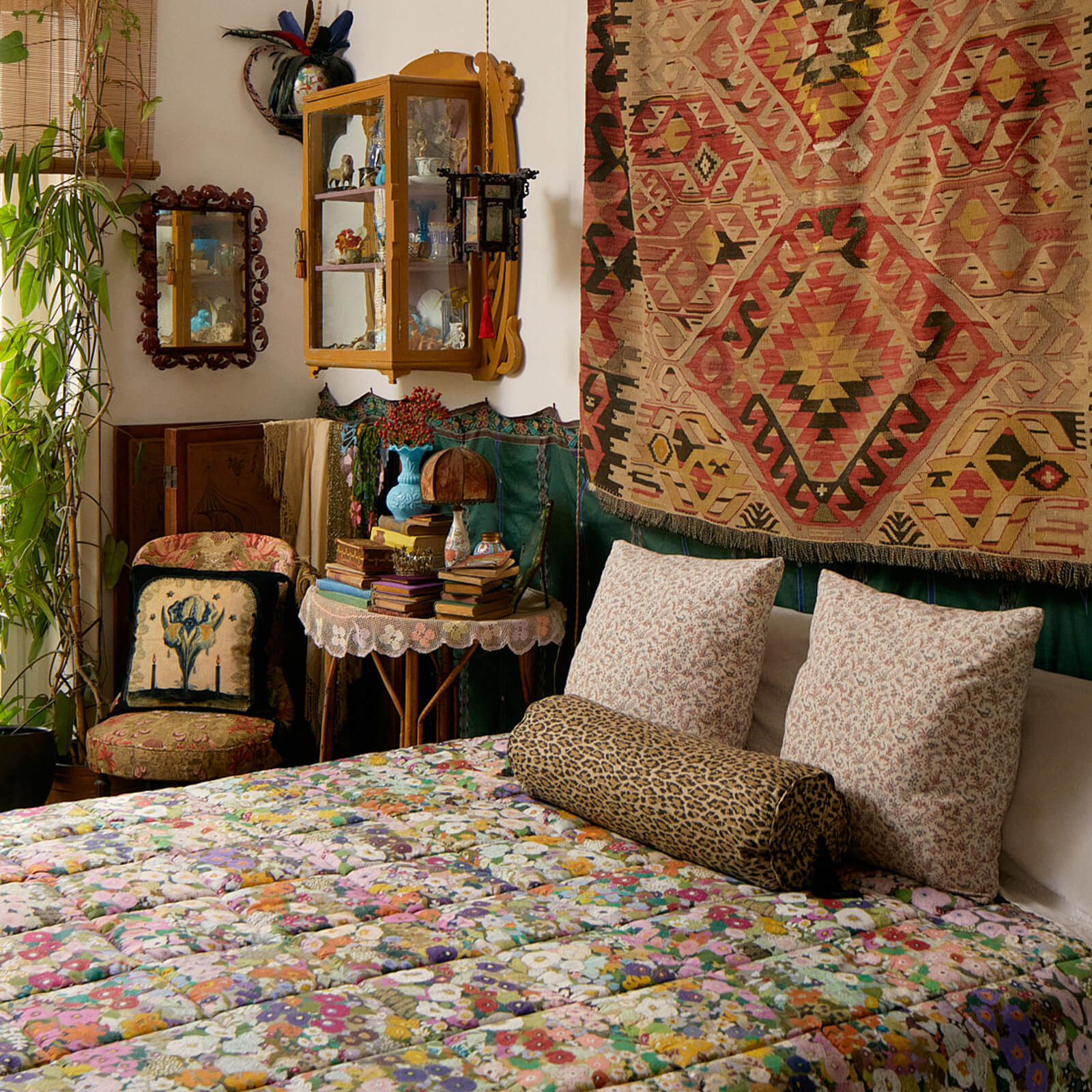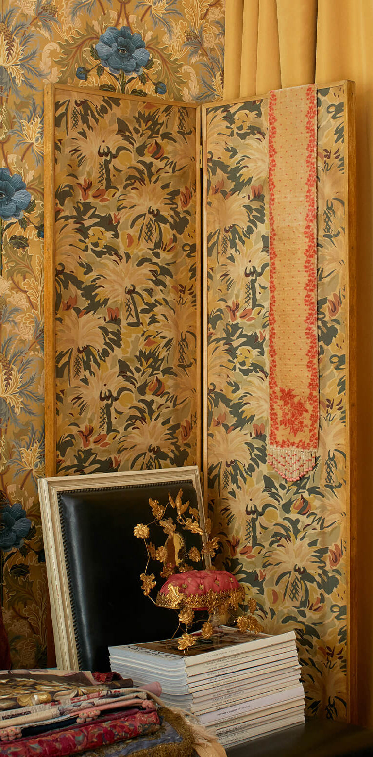 As avid collectors of antiques, textiles, curiosities, and all things beautiful, my partner and I envisioned our Fantasy Room as a blend of our existing collection and the products created in collaboration with House of Hackney. This space is not only a spare bedroom for guests but also serves as our dressing room, exuding a boudoir-like atmosphere filled with my antique clothing, handbags, jewellery, and memorabilia. There’s a palpable sense of horror vacui in both my artworks and our home decor, where every detail and element holds significance, evoking the feeling of a grand Victorian scrapbook.